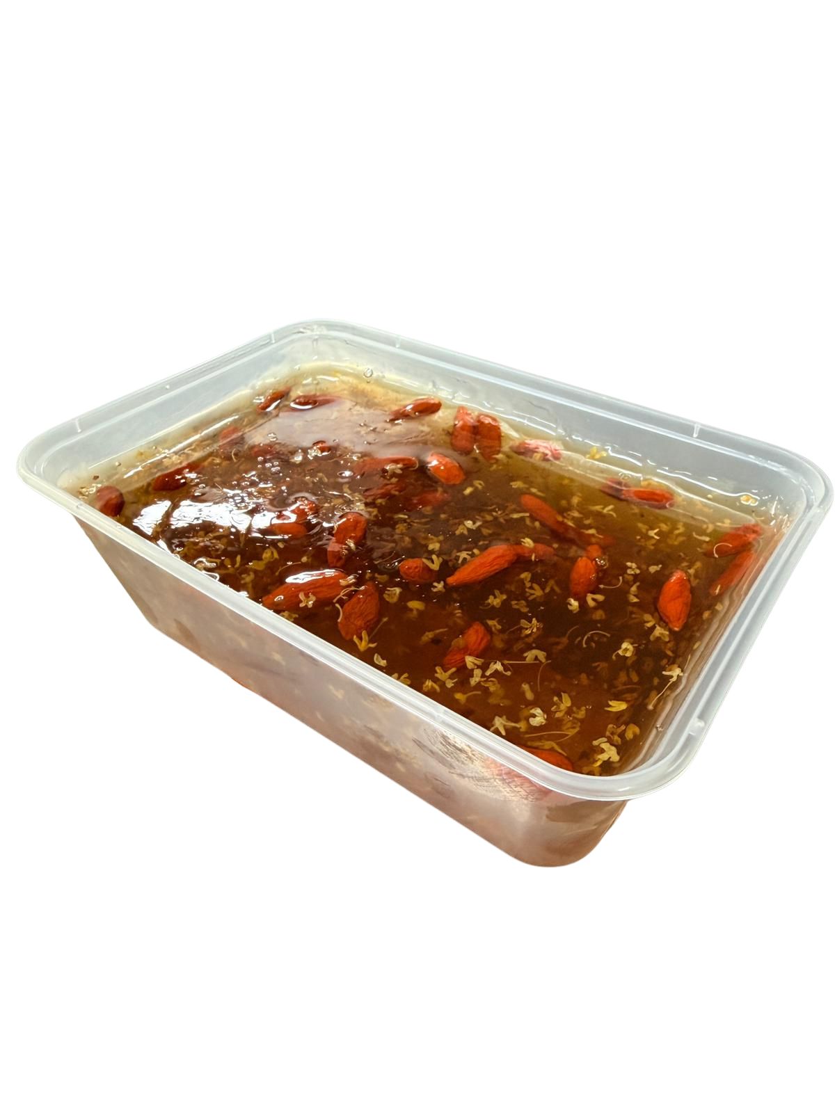 食物名稱及份量 :E. 傳統桂花糕 (600g裝) 食物成份:果糖、桂花、杞子、白砂糖、魚膠粉及水 保存方法 :需冷藏於攝氏0至4度雪櫃 ✨最佳食用日期:約為10天(不含任何防腐劑) ✨訂購日期:由即日起至6/2/2026(星期五) ✨全部糕點新鮮製作,請於5個工作天前預訂 ✨門市 取貨日期:9/2/2026 (星期一) 至 16/2/2026(星期一)