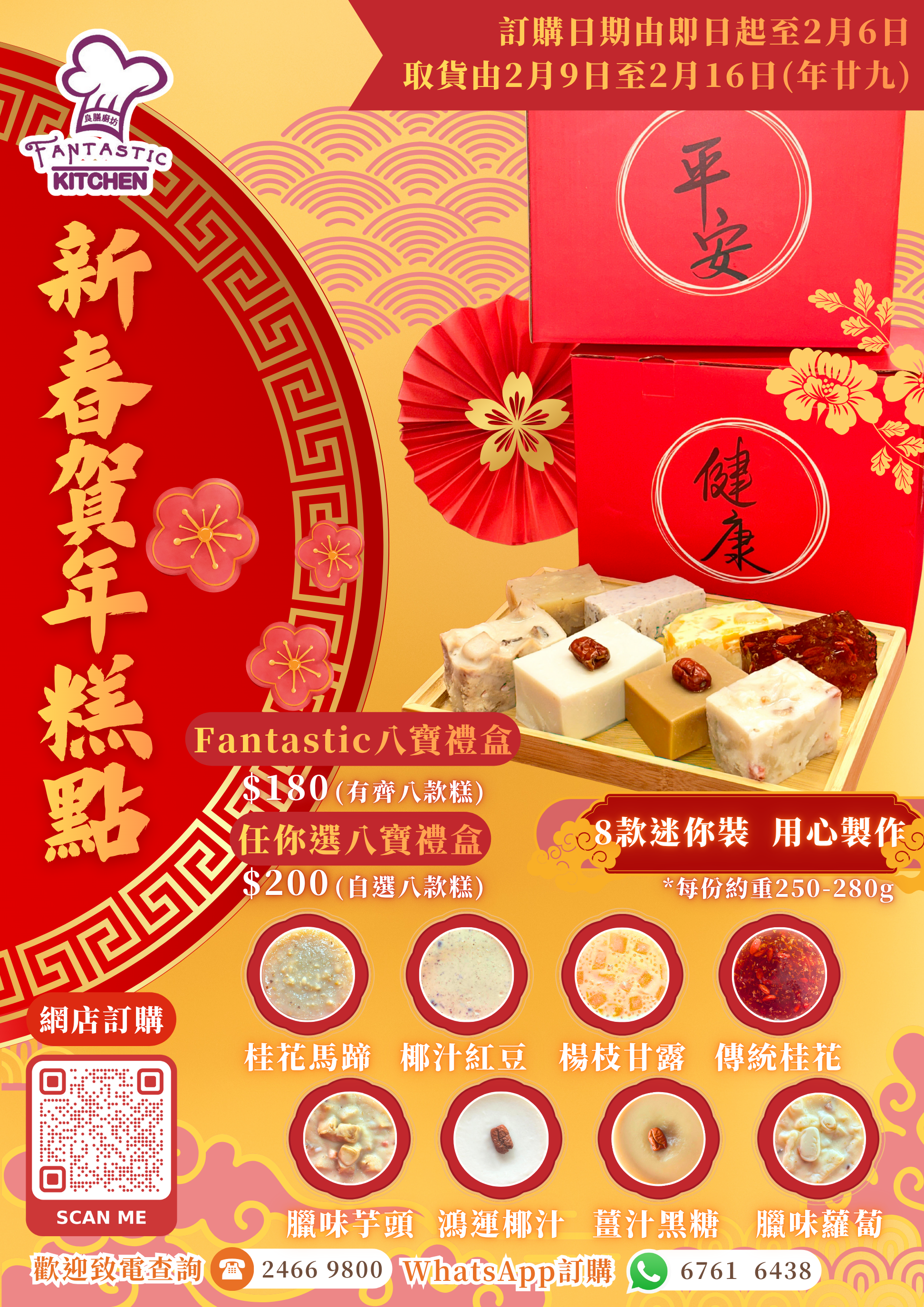 食物名稱及份量:(每個迷你糕重約250—280g) A. 迷你薑汁黑糖年糕 食物成份 :糯米粉、粘米粉、片糖、水、紅棗及薑汁 B. 迷你傳統臘味蘿蔔糕 食物成份 :糯米粉、粘米粉、生粉、澄麵、糖、鹽、胡椒粉、麻油、水、蘿蔔、臘腸、臘肉、蝦米 C. 迷你五香臘味芋頭糕 食物成份 :糯米粉、粘米粉、生粉、澄麵、糖、鹽、胡椒粉、麻油、水、芋頭、臘腸、臘肉、蝦米 D. 迷你鴻運椰汁年糕 食物成份 :糯米粉、粘米粉、椰醬、砂糖、水 E. 迷你傳統桂花糕 食物成份 :果糖、桂花、杞子、白砂糖、魚膠粉及水 F. 迷你椰汁紅豆糕 食物成份 :椰汁、花奶、牛奶、白砂糖、魚膠粉及紅豆 G. 迷你桂花馬蹄糕 食物成份 :馬碲粉、鷹粟粉、油、黃片糖、馬碲、桂花、水 H. 迷你楊枝甘露糕 食物成份 :芒果、金柚肉、爆珠、椰醬、奶、淡忌廉、魚膠粉、砂糖、芒果啫喱粉、芒果糖漿、水 保存方法 :需冷藏於攝氏0至4度雪櫃 ✨最佳食用日期:約為7天(不含任何防腐劑) ✨訂購日期:由即日起至6/2/2026(星期五) ✨全部糕點新鮮製作,請於5個工作天前預訂 ✨門市 取貨日期:9/2/2026 (星期一) 至16/2/2026(星期一)